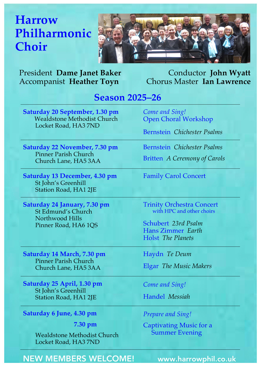 Harrow Philharmonic Choir was founded in 1959 so the season, from Autumn 2019 to June 2020 was its Diamond Jubilee Season.